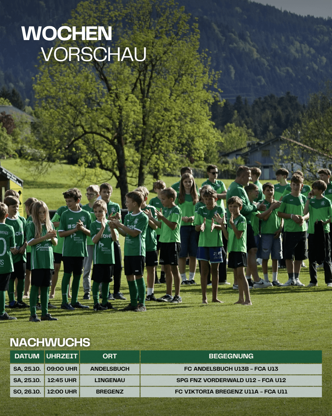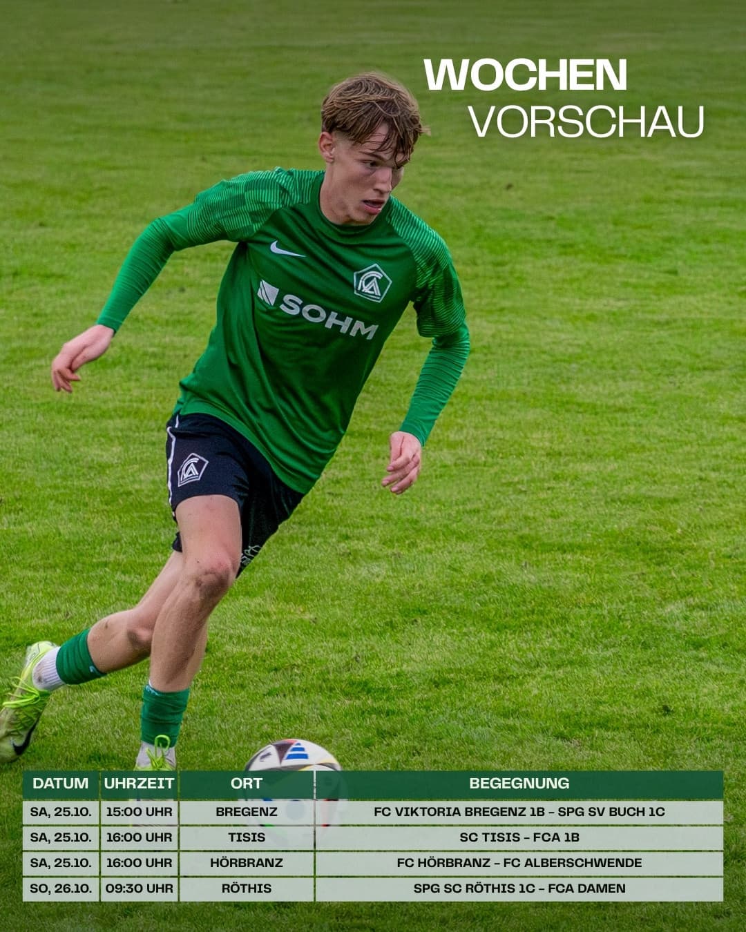 Auch unsere weiteren Mannschaften sind an diesem Wochenende auswärts gefordert: Das 1b-Team reist zeitgleich zum Tabellenführer nach Tisis, unsere 1c-Mannschaft tritt um 15:00 Uhr in Bregenz an und die Damen bestreiten am Sonntag, dem Nationalfeiertag, bereits um 09:30 Uhr in Röthis ihr nächstes Ligaspiel.