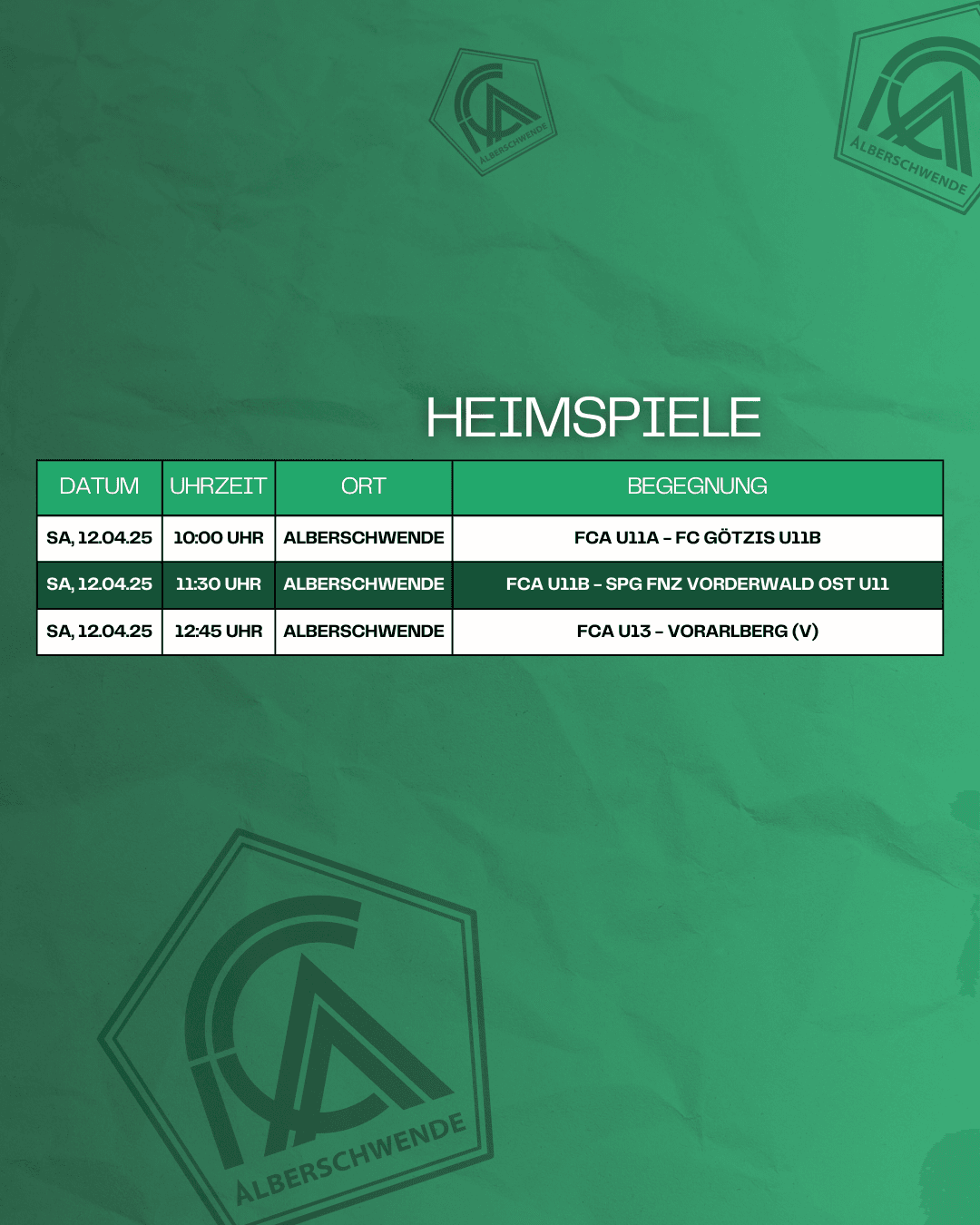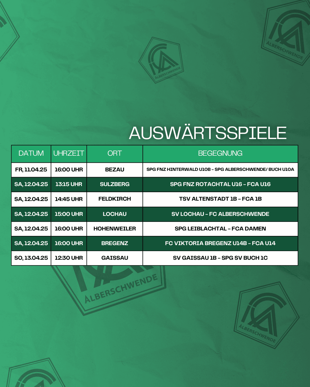 Alle Kampfmannschaften des FC Alberschwende sind am kommenden Wochenende auf Auswärtstour. Unser U13 und U11 haben hingegen Heimspiele. Hier ist der Überblick: