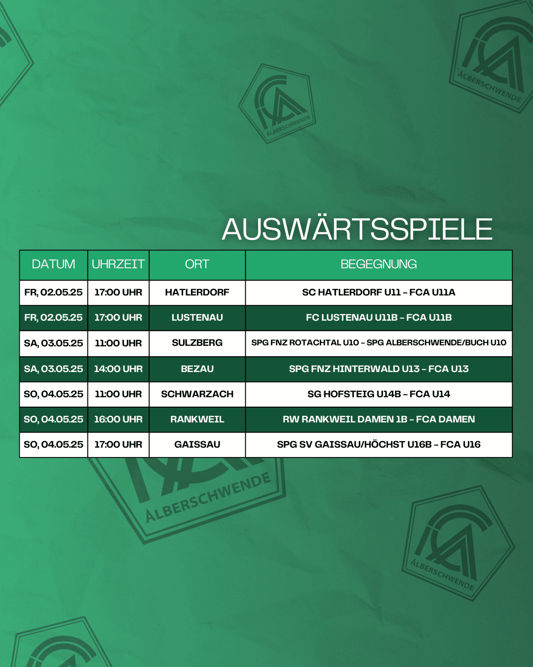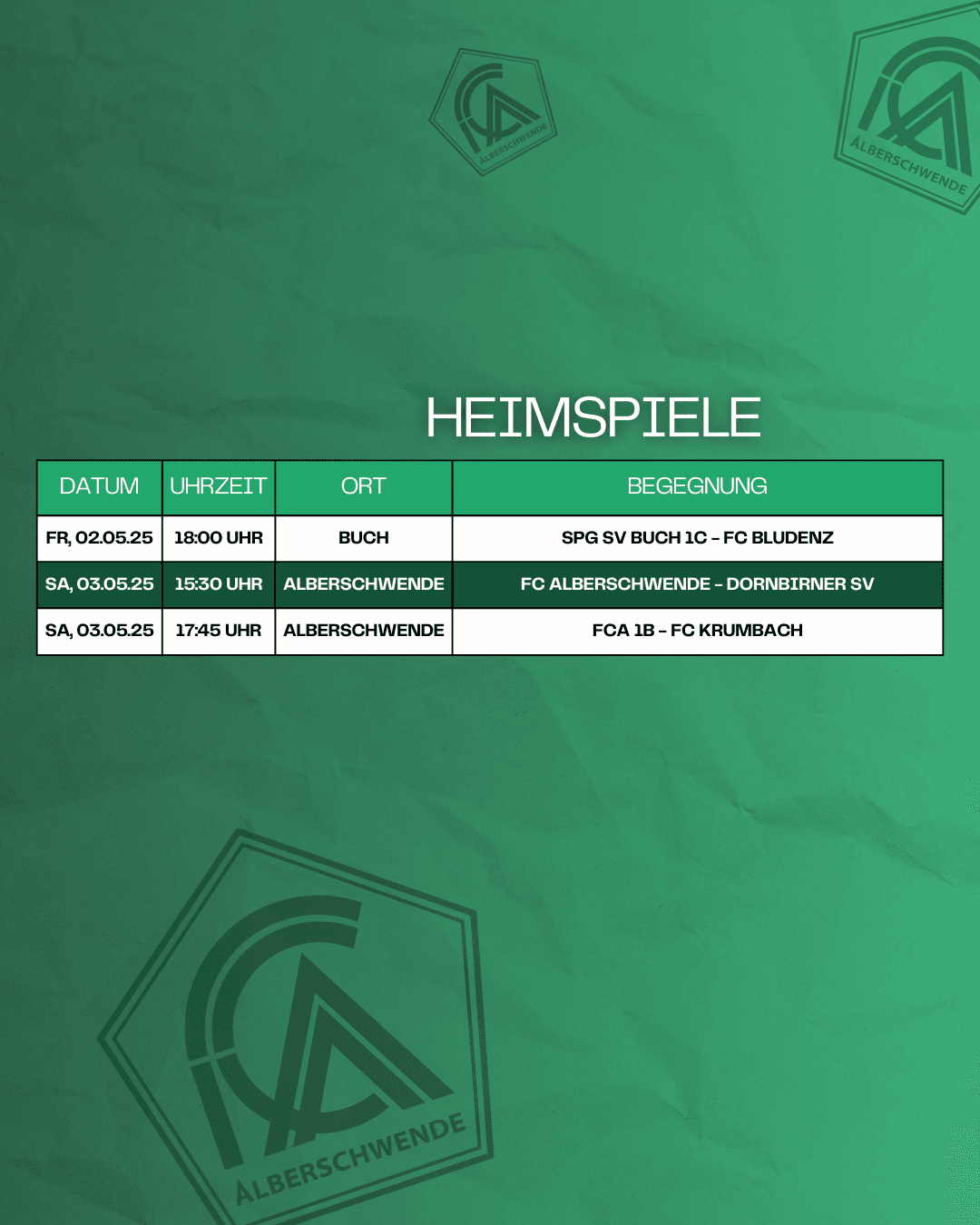 Diesen Samstag empfangen wir den DSV zum Heimspiel – Anpfiff am Sportplatz Alberschwende ist um 15:30 Uhr, im Anschluss trifft unser 1b-Team im Wälderderby auf den FC Krumbach!