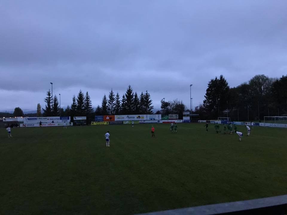 Nur zwei Tage später waren wir in Röthis zu Gast. Mit einer grob veränderten Startelf ging man von Anfang an konzentrierter an's Werk. Esref Demircan sorge für die Führung nach 14 Minuten. Die Röthner kamen immer wieder vor unser Tor, doch der Kasten blieb bis in die 80. Minute sauber. Ein leicht abgefälschter Schuss im Strafraum ging unter den Händen von Manuel Willam über die Linie - 1:1. Die Antwort folgte auf den Punkt. Nico Kohler schnappte sich nach dem Anstoss den Ball. Doppelpass mit "Eschi". Pass zu Jan Gmeiner, der die Situation erkannte und den Ball mit der Hacke direkt ins Loch spielte. Dort kam Nico wieder angerannt und schob die Kugel am Goalie vorbei ins Tor. Auch der Jubel auf der Tribüne der vielen mitgereisten Fans war groß. Jetzt stand man - bei immer näher kommender Dunkelheit - hinten sicher und konterte bei Gelegenheit. Den Schlusspunkt setzte abermals Esref Demircan, der vor dem Tor cool blieb und locker zum 3:1 einschob. Mittlerweile sah man weder Freund noch Feind noch Fans, es ist (fast) dunkel geworden in Röthis (Bild). Am Ende merken wir uns zwei Dinge: 1. Mit einer geschlossenen Mannschaftsleistung ist alles möglich und 2. Sag' kein Spiel um 15:30 Uhr in der Winterzeit an ;).