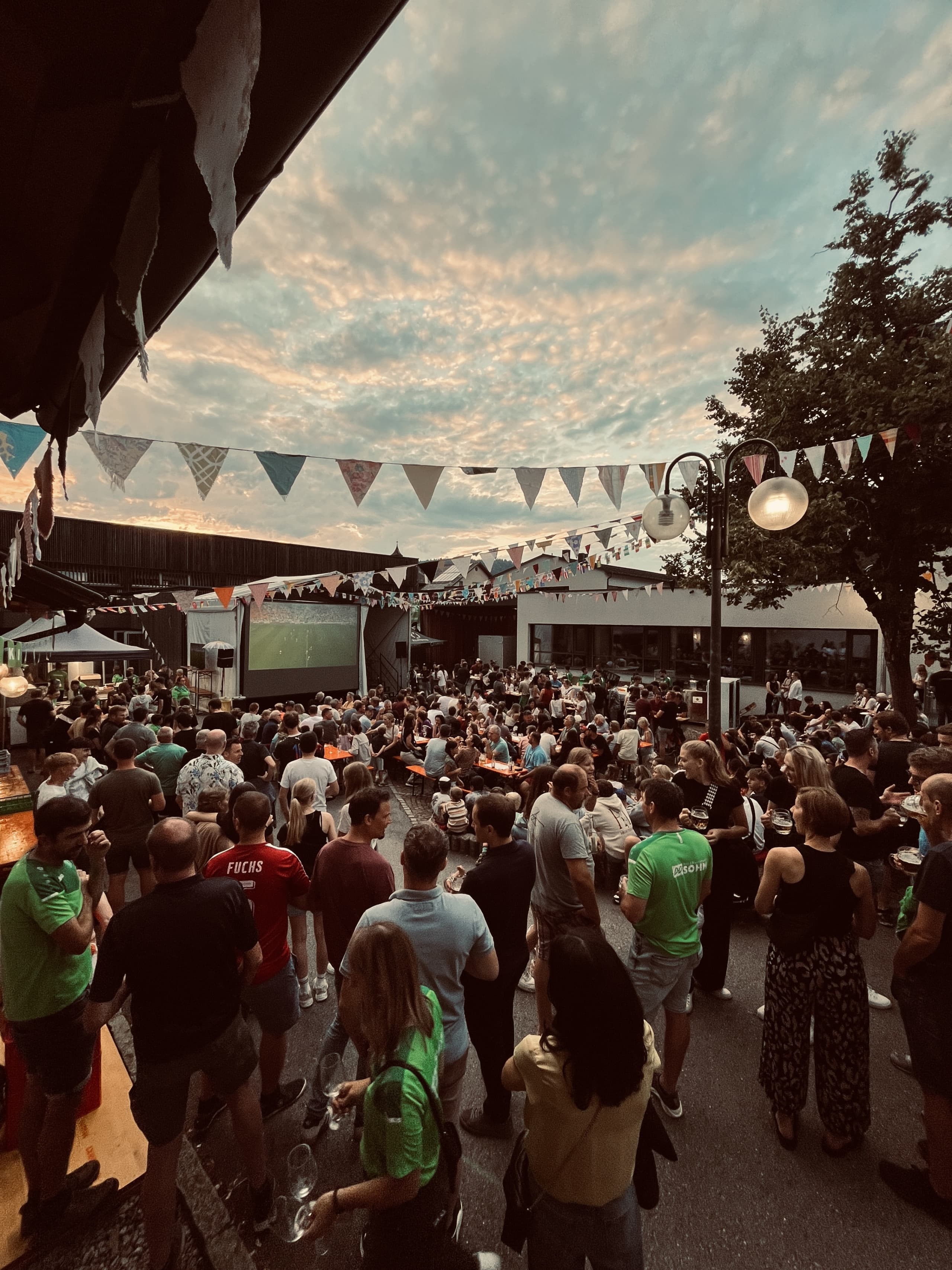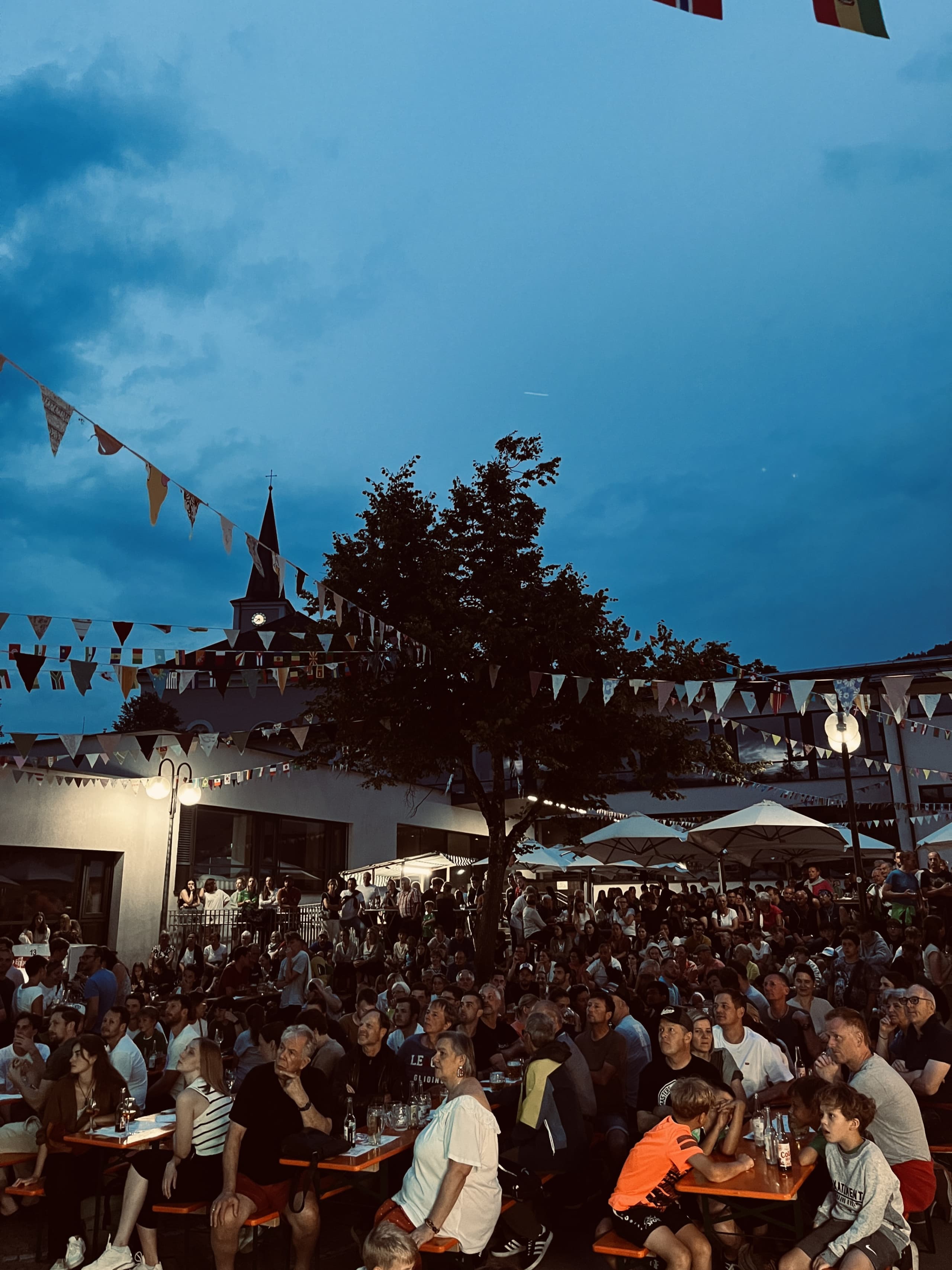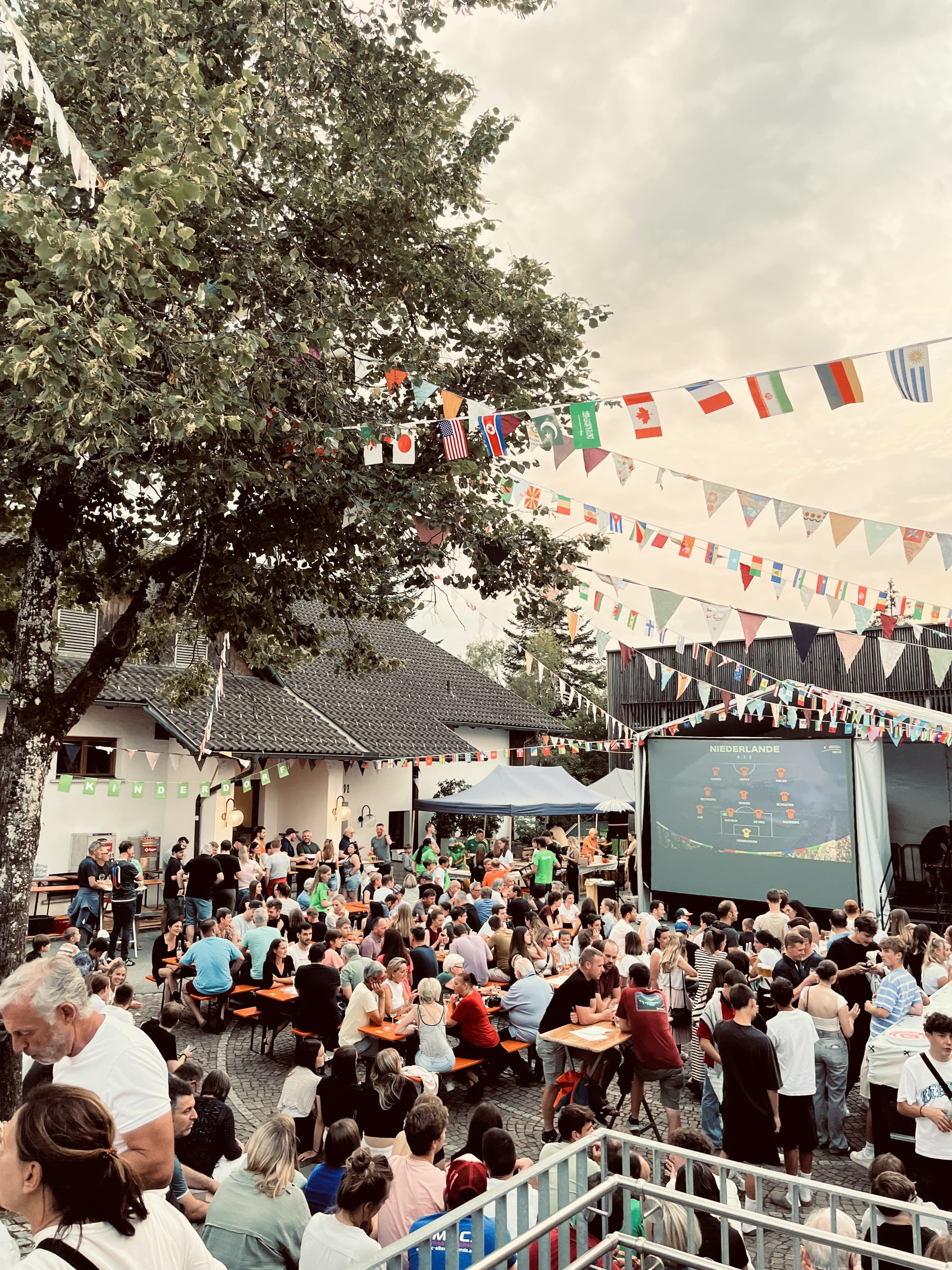 Bereits um 19:00 Uhr fanden sich zahlreiche Familien und Fußballbegeisterte im Ortszentrum von Alberschwende ein, um das Halbfinalspiel zwischen den Niederlanden und England zu verfolgen.