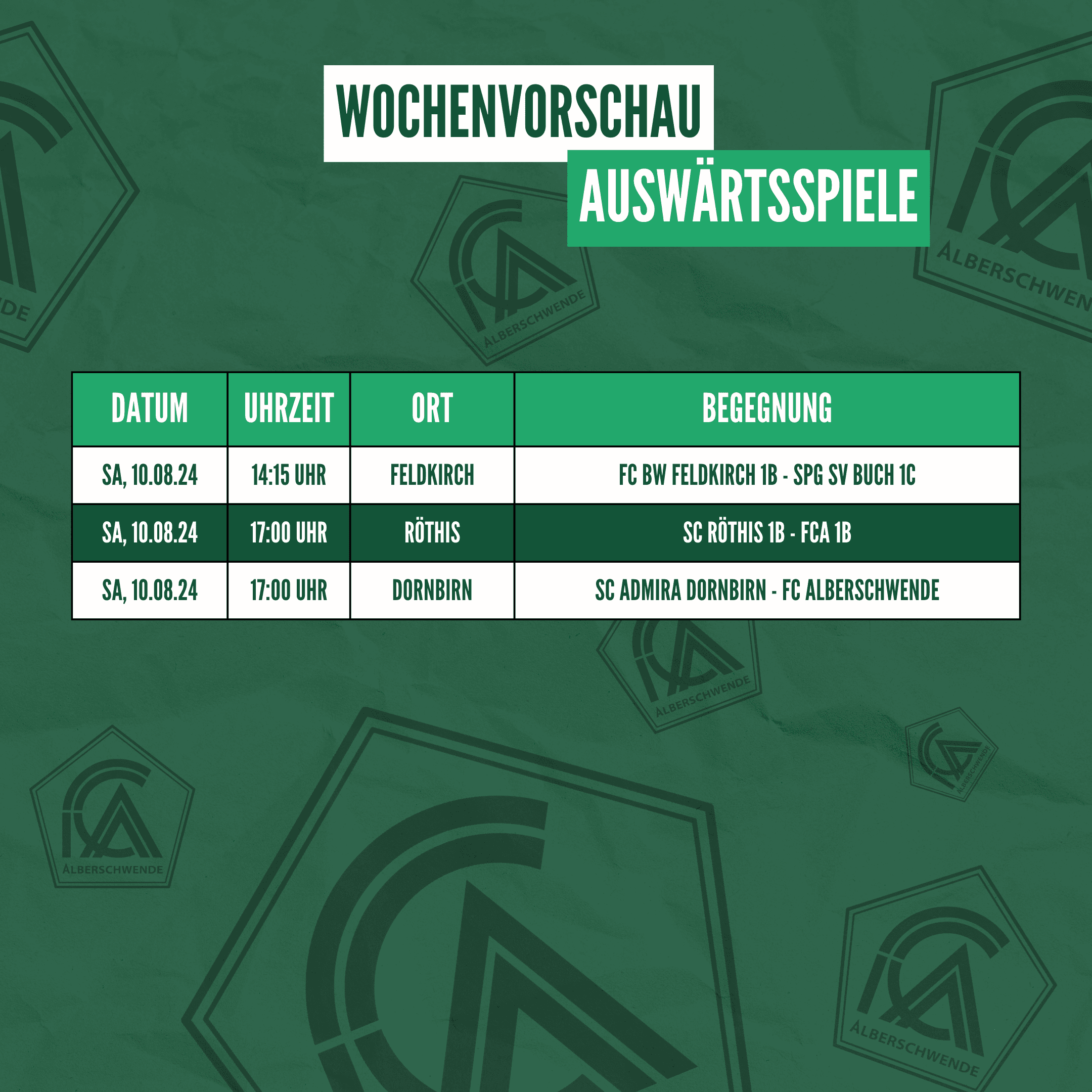 Am Samstag starten dann alle Herrenmannschaften auswärts in die erste Runde der jeweiligen Ligen. Unser 1c- und 1b-Team sind in Feldkirch bzw. in Röthis unterwegs, während die erste Mannschaft um 17:00 Uhr in Dornbirn bei der Admira gastiert.